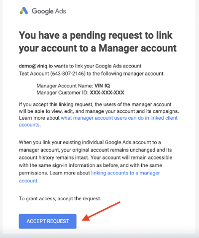 4. After sending your customer ID, look for an email from Google with the subject “You have a pending request to link your account to a Manager account (VIN IQ)”.